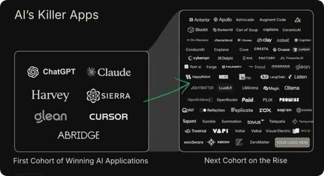 回到应用层的话题。我们现在认为,第一批AI的杀手级应用已经出现,比如 ChatGPT、Harvey、Glean、Sierra、Cursor、Abridge 等。而且,在众多丰富多样的终端市场上,有一大批新公司正在崛起,包括 Listen Labs、Open Evidence,还有 WorkOS 等,今天在座的很多人可能都有所了解。