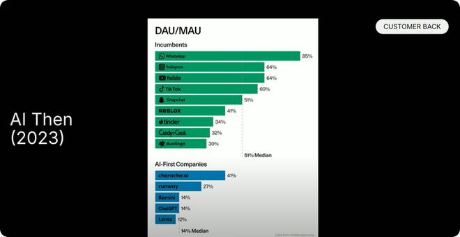 接下来我将重点介绍AI目前的发展情况。我们先从客户需求和技术发展两个角度进行快速的年度回顾。先回顾一下 2023 年,我们当时展示了这张图表,对比了原生AI应用和传统移动应用的日活跃用户与月活跃用户的比例。