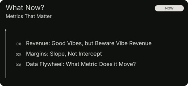 下面是AI公司特有的 5% 的标准。第一是收入。收入的 “感觉” 很重要,收入可能会 “迷惑” 你。大家都喜欢高收入,感觉很棒,“我们收入好多啊,快看看”。但这是真正的业务增长,还是仅仅是短期的 “尝鲜” 行为呢?